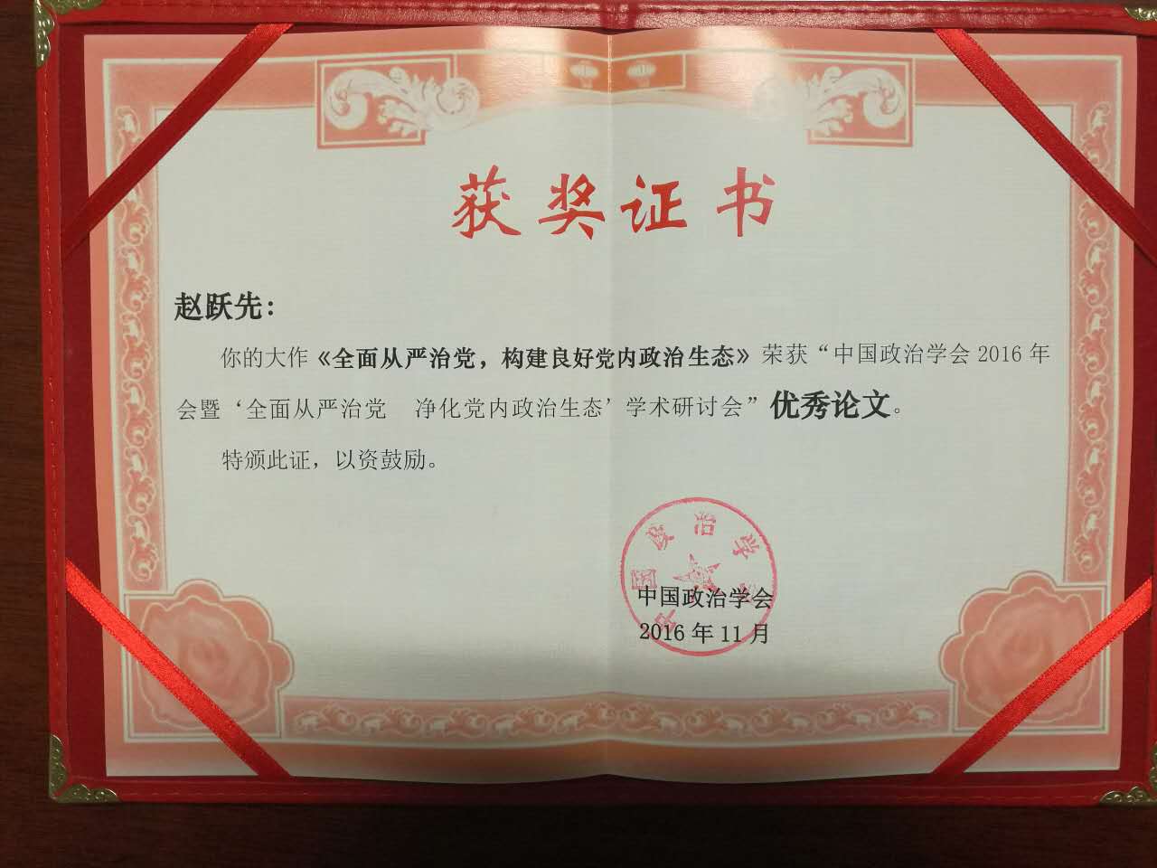 本次年会为期2天,政治学界知名专家高建、包心鉴、张献生、杨海蛟、王浦劬、桑玉成、张桂琳、周光辉、房宁、周平,以及来自中国社科院、北京大学、复旦大学、浙江大学等中国政治学研究领域的专家学者近400余人出席会议。世界杯官网教师赵跃先、胡志远和政法学院赵笑蕾老师参加了本次年会。本次会议共收到论文143篇,最终评出“优秀论文”11篇,世界杯官网教师赵跃先教授撰写的论文《全面从严治党,构建良好党内政治生态》获“优秀论文”奖。