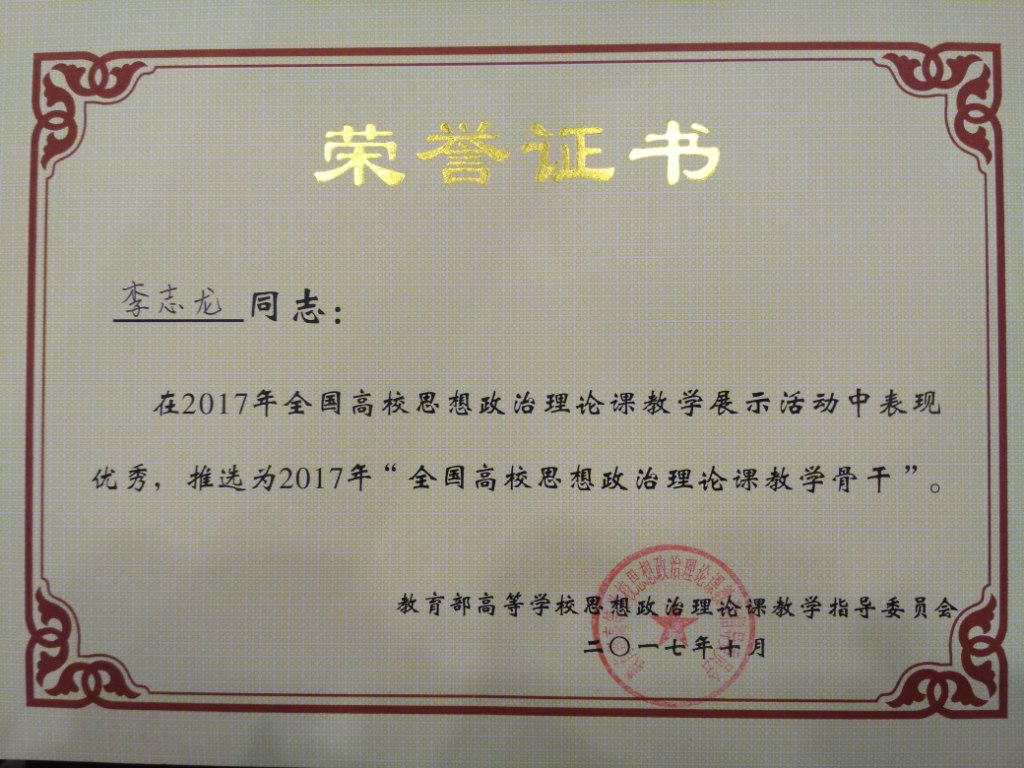 世界杯官网教师李志龙荣获“全国高校思想政治理论课教学骨干”荣誉称号