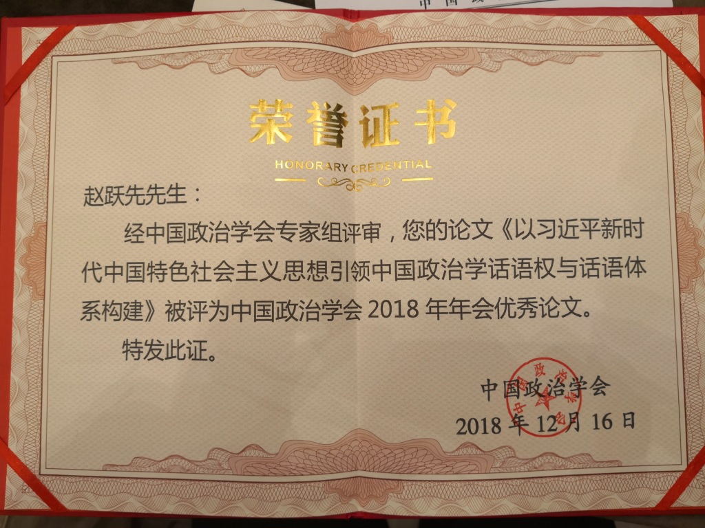 本次会议共设6个分论坛,与会代表分别围绕马克思主义政治学话语体系建设的相关理论议题,以及改革开放以来中国的政治建设与政治学发展展开了热烈讨论和对话。各分论坛代表在闭幕会上就分论坛的讨论成果进行了汇报和交流。会议还为获得本次年会优秀论文的18位作者颁发了荣誉证书,世界杯官网赵跃先、胡志远老师所撰写的论文获此殊荣。中国政治学会副会长兼秘书长杨海蛟教授在总结发言中充分肯定了会议研讨的成果和会议组织的质量,并再次表达了对夏书章教授的崇高敬意。