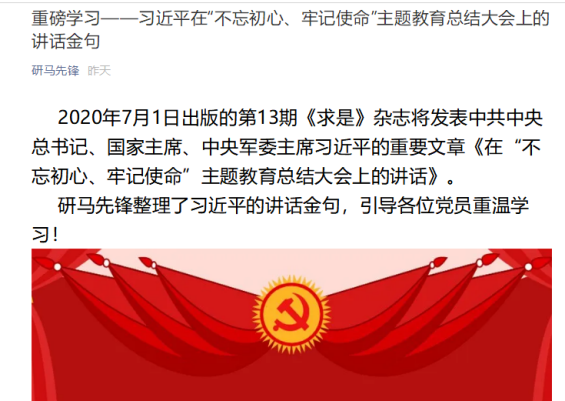 一、认真开展线上政治理论学习。研究生第二党支部借助微信工作平台在建党99周年当日推出习近平在“不忘初心、牢记使命”主题教育总结大会上的讲话金句、一张图读懂中共山西省委第十一届十次全会的学习材料,突出重点,提升学习实效。支部动员党员认真学习,掀起学习热潮。