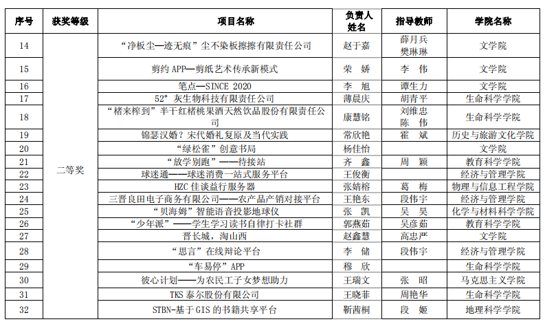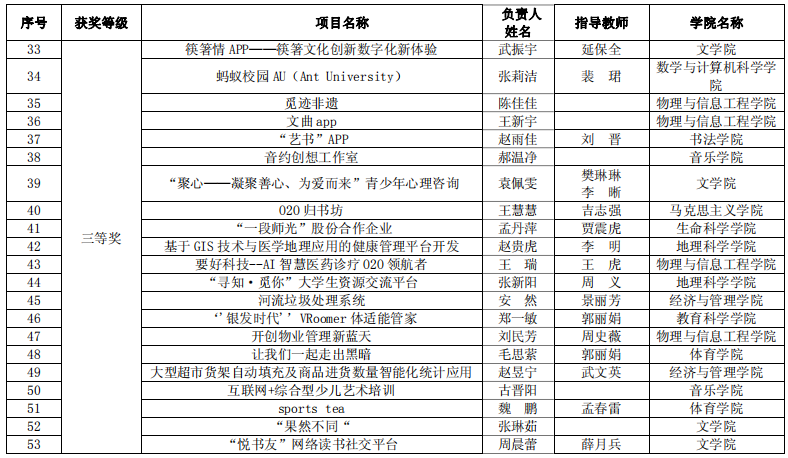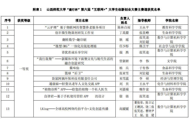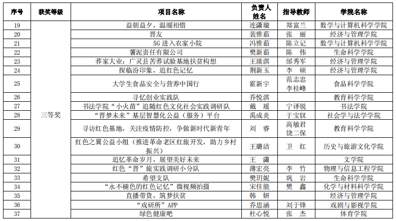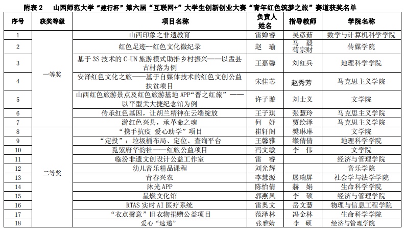 世界杯官网于2020年6月启动了该项赛事的报名工作,截止2020年8月3日,世界杯官网累计参赛报名项目数 760 项,累计参赛学生人次 3201 人。其中高教主赛道632 项目,“青年红色筑梦之旅”赛道 128 项。通过学院初选共推荐 102 个项目(主赛道 65 个,“青年红色筑梦之旅”赛道 37 个)参加了校内选拔,经评委专家认真评审,主赛道共评选出一等奖 13 名,二等奖 19 名,三等奖 33 名,“青年红色筑梦之旅”赛道一等奖 7 名,二等奖 11 名,三等奖 19 名。世界杯官网宋佳芯团队、王子琪团队、何妤团队获得一等奖,王瑞文团队获得二等奖,王慧慧团队获得三等奖。