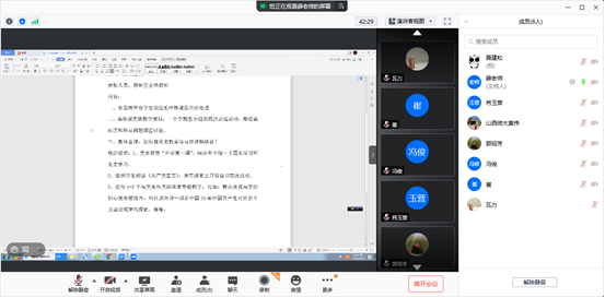 2021年3月13日晚20:00—21:00,纲要教研室组织召开会议,由教研室主任聂传平主持,教研室老师参加会议并积极发言、讨论,提出了很多有价值的思路与建议。会上,赵改萍副院长首先提出“纲要”课教师需要在教学中自觉将“中国共产党始终不渝为人民的初心使命”这个主题有机融入授课内容中;赵秀芳老师和王新中老师分别从正反两方面表达了人民群众的重要性;会议一致认为要讲好中国共产党的初心使命,让学生有更直观、深刻的理解。