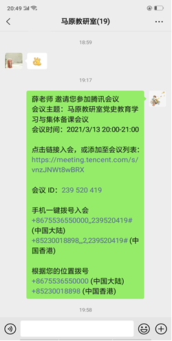 同一时间,马原教研室也召开会议。在会议中就如何将党史教育与马原课相结合进行了深入的讨论,提出了要将党史材料运用到课堂教学案例中、组织学生阅读马克思主义经典著作、将党史与课堂专题教学相结合、播放一些党史方面的视频资料等一些可行性的有效措施。