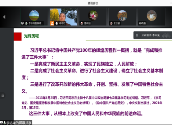 3月18日上午10:00—11:30,毛泽东思想和中国特色社会主义理论体系概论教研室进行集体备课,教研室主任胡志远主持,并强调了这次集体备课的重要性和学习党史的重要意义。随后,教研室的每位教师都谈了学习党史的心得体会,吉志强教授指出作为思政课教师,“四史”学习要突出重点,更要解决好学和用的关系;陈燕妮老师阐述了我们党始终坚持以人民为中心的发展思想;段艳老师从党的世界大局角度进行了发言;其他老师也积极踊跃发言,从“觉醒”、“建党”、“革命”、“改造”、“建设”等几个历史时期追寻中国共产党始终为人民的初心与使命;会议最后贾绘泽教授对中国共产党始终不渝为人民的初心历史进行了总结,特别强调要采取有效措施使“四史”进课堂、进教材、进头脑。