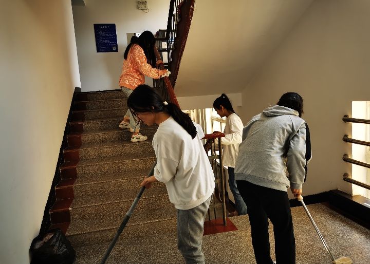 与此同时,20级各班以宿舍为单位进行了自主劳动。同学们对宿舍、洗漱间、楼道、学校巨人广场及图书馆门前座椅、教室等不同区域进行了打扫,让自己生活的区域变得干净起来。
