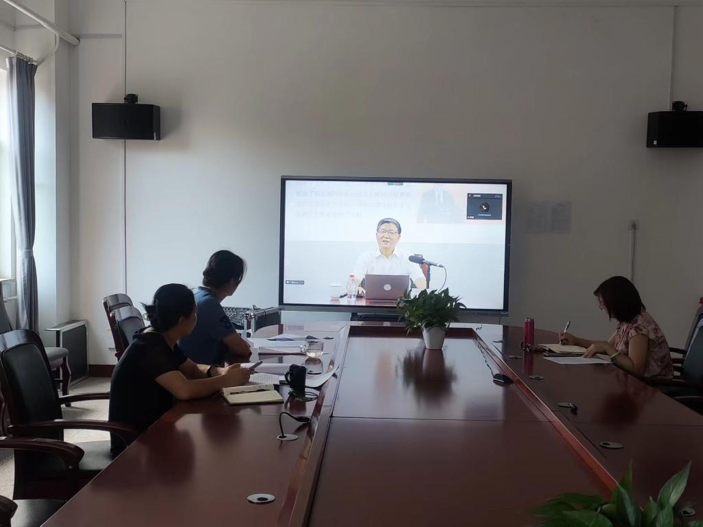 会上,全体中心组成员集中观看了“周末理论大讲堂”暑期特别版“经典导读课程第100讲”——导学习近平总书记著作《论把握新发展阶段、贯彻新发展理念、构建新发展格局》。本次讲座由中央党校一级教授、马院院长张占斌主讲。张占斌教授以“新发展阶段、新发展理念、新发展格局”为主线,详细阐述了中华民族伟大复兴新征程的开启、高质量发展和高品质生活的引领以及相互促进的国内国际双循环的构建,指出三个“新发展”是中国特色社会主义政治经济学的最新成果。
