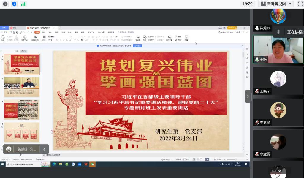 8月25日晚,2026世界杯官方合作网站研究生第一党支部开展主题党日活动,专题学习习近平在省部级主要领导干部“学习习近平总书记重要讲话精神,迎接党的二十大”专题研讨班开班式上的重要讲话。支部书记王艳专题领学,全体党员参加学习。