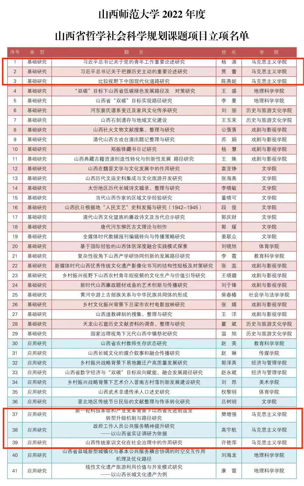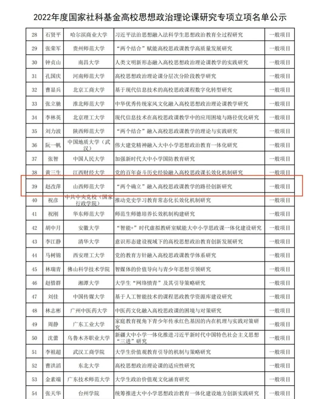 近日,2022年度国家社科基金高校思想政治理论课研究专项立项名单和山西省哲学社会科学规划课题项目评审结果公布。世界杯官网赵改萍副院长的《“两个确立”融入高校思政课教学的路径创新研究》获批国社科高校思政课研究专项一般项目,杨源、贾蕾、陈燕妮、樊增强、高宇航、许艳萍六位老师获批省哲社规划课题基础研究和应用研究项目。
