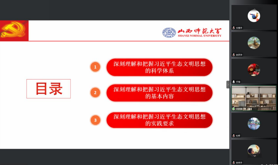 吉志强副院长专题领学了《习近平生态文明思想学习纲要》,从“三个深刻把握和理解”角度出发,结合党的二十大报告,重点解读了习近平生态文明思想的科学体系、基本内容和实践要求。
