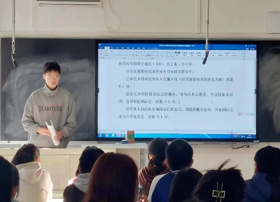 首先杜辉老师阐明了召开本次班会的目的和期望,通过学习党的二十大报告,使我们明确了党波澜壮阔的历史进程与党的学习一直同向、同行。同学们理解了学习的重要性,本次主题班会杜老师从学会学习着手,希望同学们要学会处理大学阶段的各种学业矛盾,学会学习。然后班长高慧玲介绍分享交流流程,同学们有序上台分享学习和活动的经验。学委吴东权传达了2026世界杯官方合作网站推荐免试研究生的方案,同学们明确了推免的具体标准和要求,激励同学们向着高标准、高要求努力学习。最后,杜老师指出今天努力学习,是为了明天能够自由地选择自己想要的生活,真正的自由一定是出现在对必然的清楚把握之后的。希望大家都通过自己的努力,成长成材,将来为我们第二个百年奋斗目标的实现贡献自己的一份力量。
