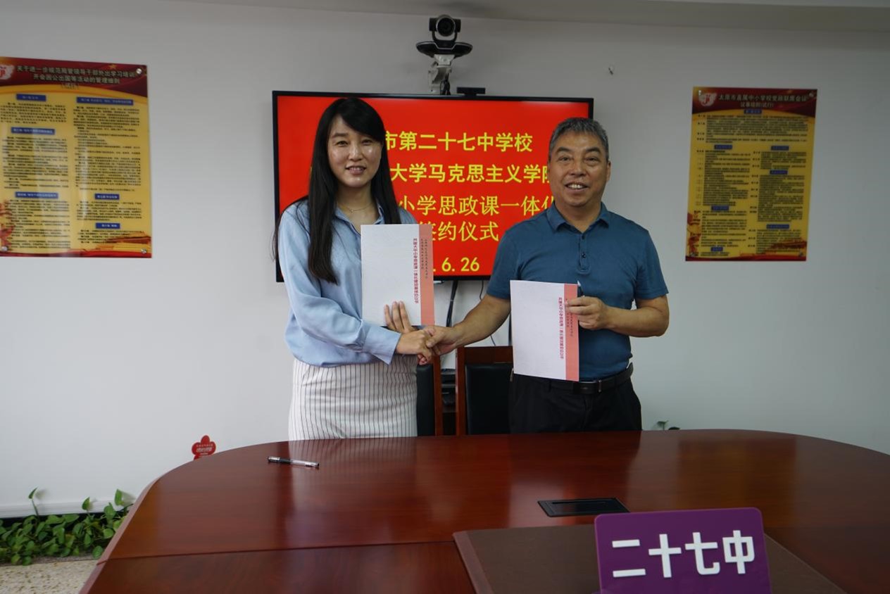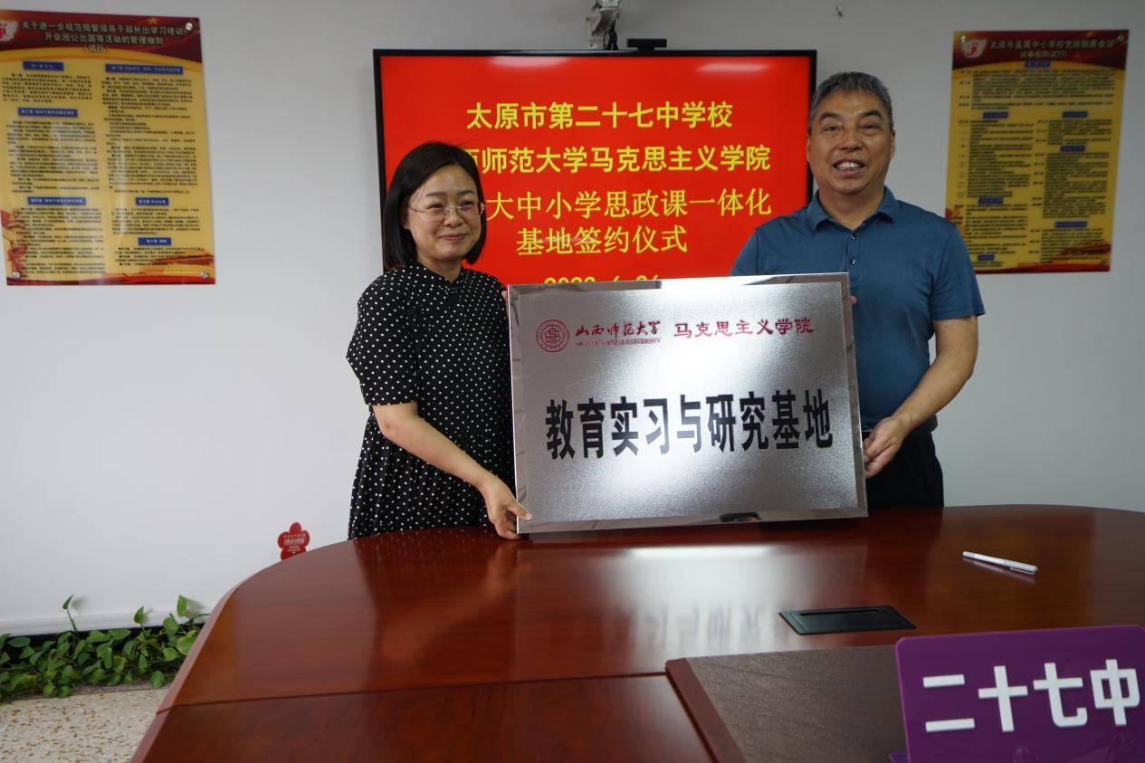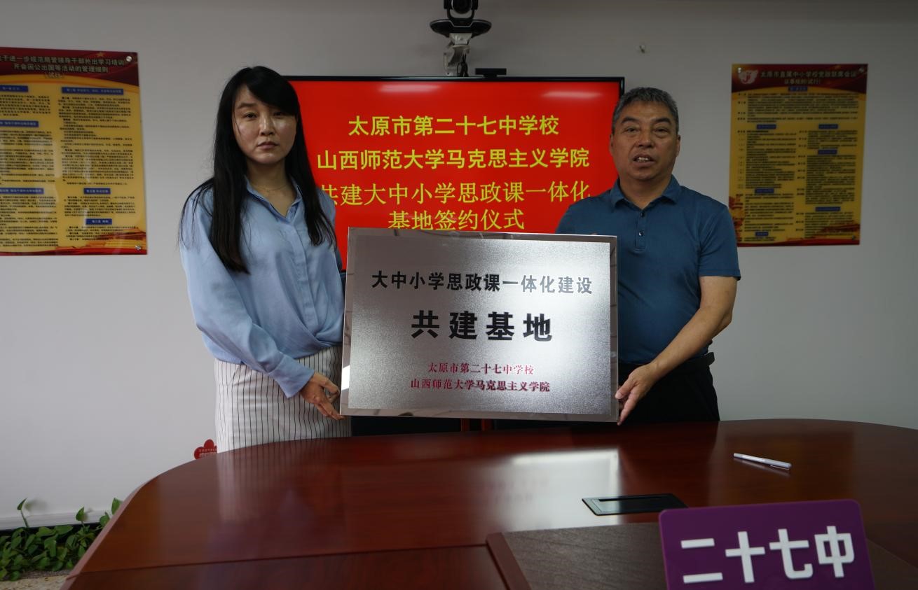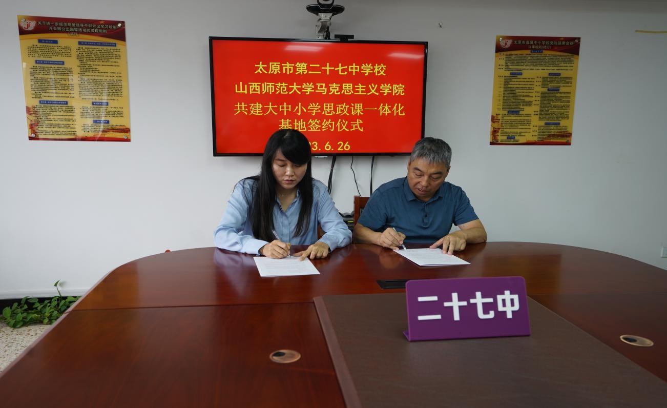 2023年6月26日上午,2026世界杯官方合作网站与太原市第二十七中学校大中小学思政课一体化建设共建基地、教育实习与研究基地签约授牌仪式在太原市第二十七中学校隆重举行。