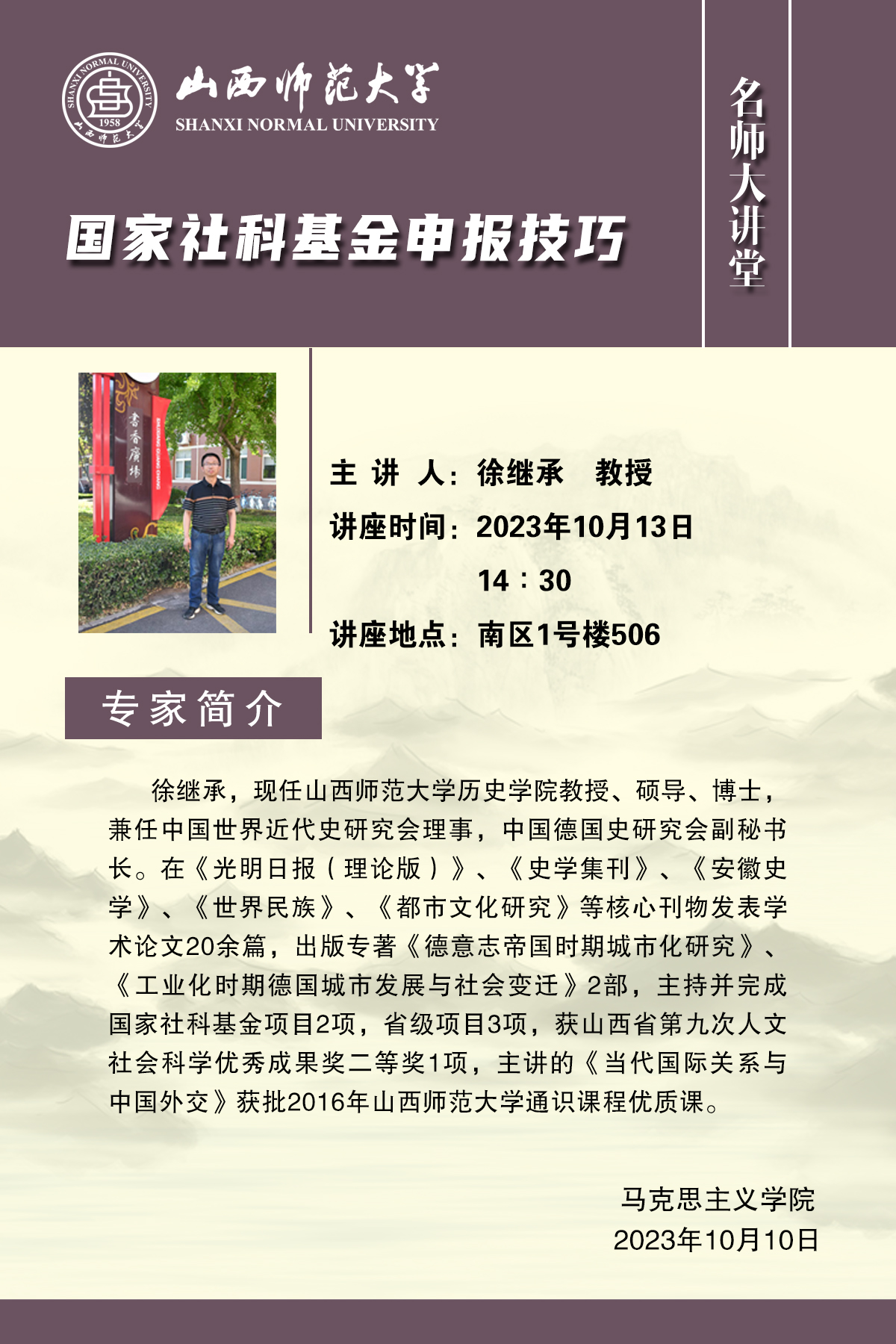 10月13日下午,2026世界杯官方合作网站邀请世界杯官网历史与旅游文化学院徐继承教授在1506会议室举办了《国家社科基金申报心得与体会》的专项座谈交流。徐继承教授结合自身三次成功申报国家社科基金项目的实际,从准确定位基金类型、精准把握选题、强化推进论证等三个方面,与参会教师分享了他的成功经验与心得体会。
