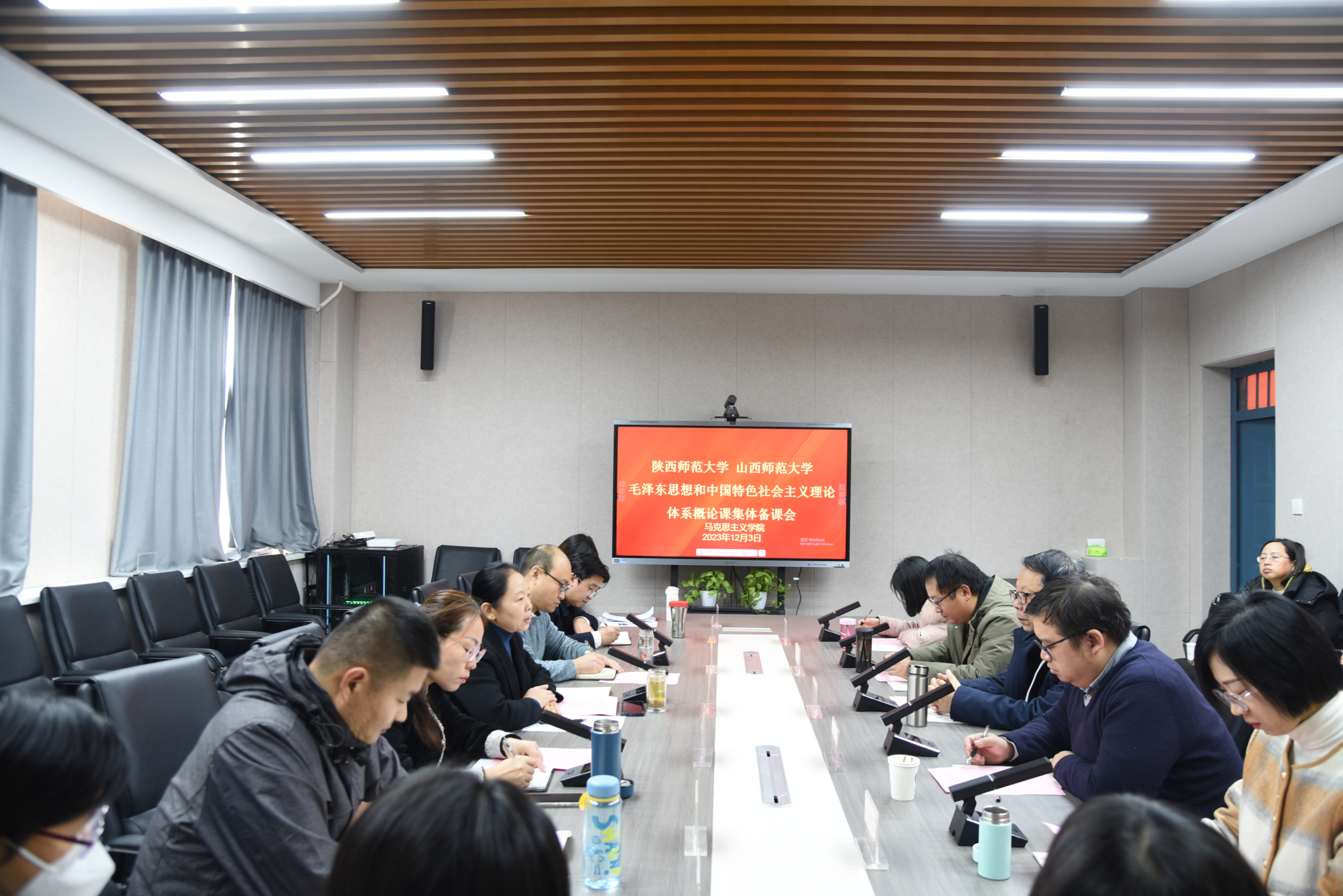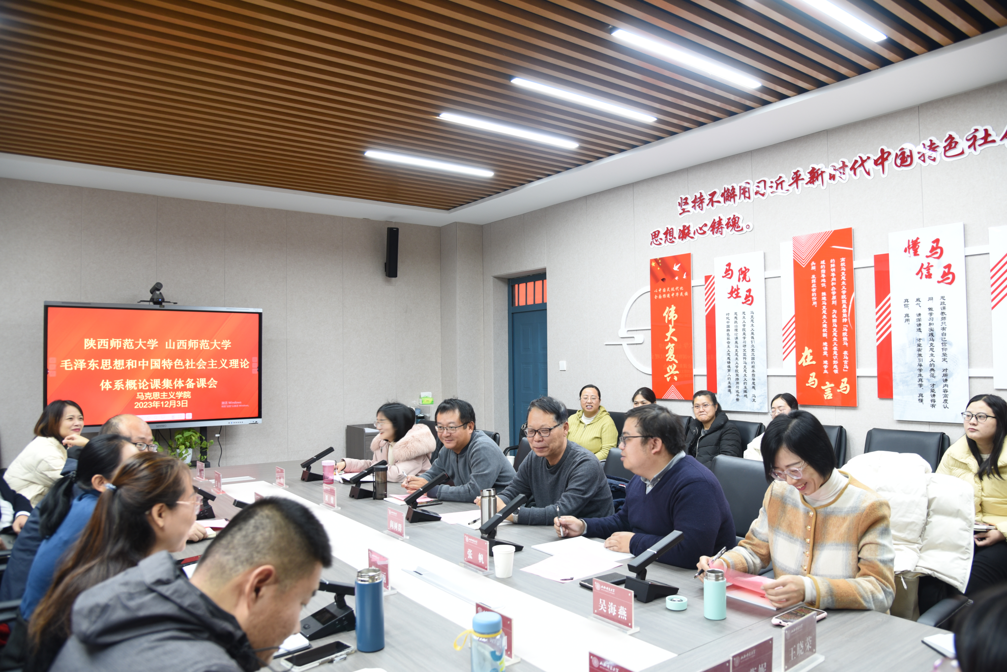 为促进两地高校教育教学交流合作,共享优质教育资源,进一步提高思政课教学效果,营造浓郁的教学研究氛围,12月3日上午,世界杯官网“毛泽东思想和中国特色社会主义理论体系概论教研室”邀请陕西师范大学2026世界杯官方合作网站阎树群教授等5名教师共同举行了一堂跨校集体备课会。备课会由世界杯官网副院长(挂职)杨海亮主持。