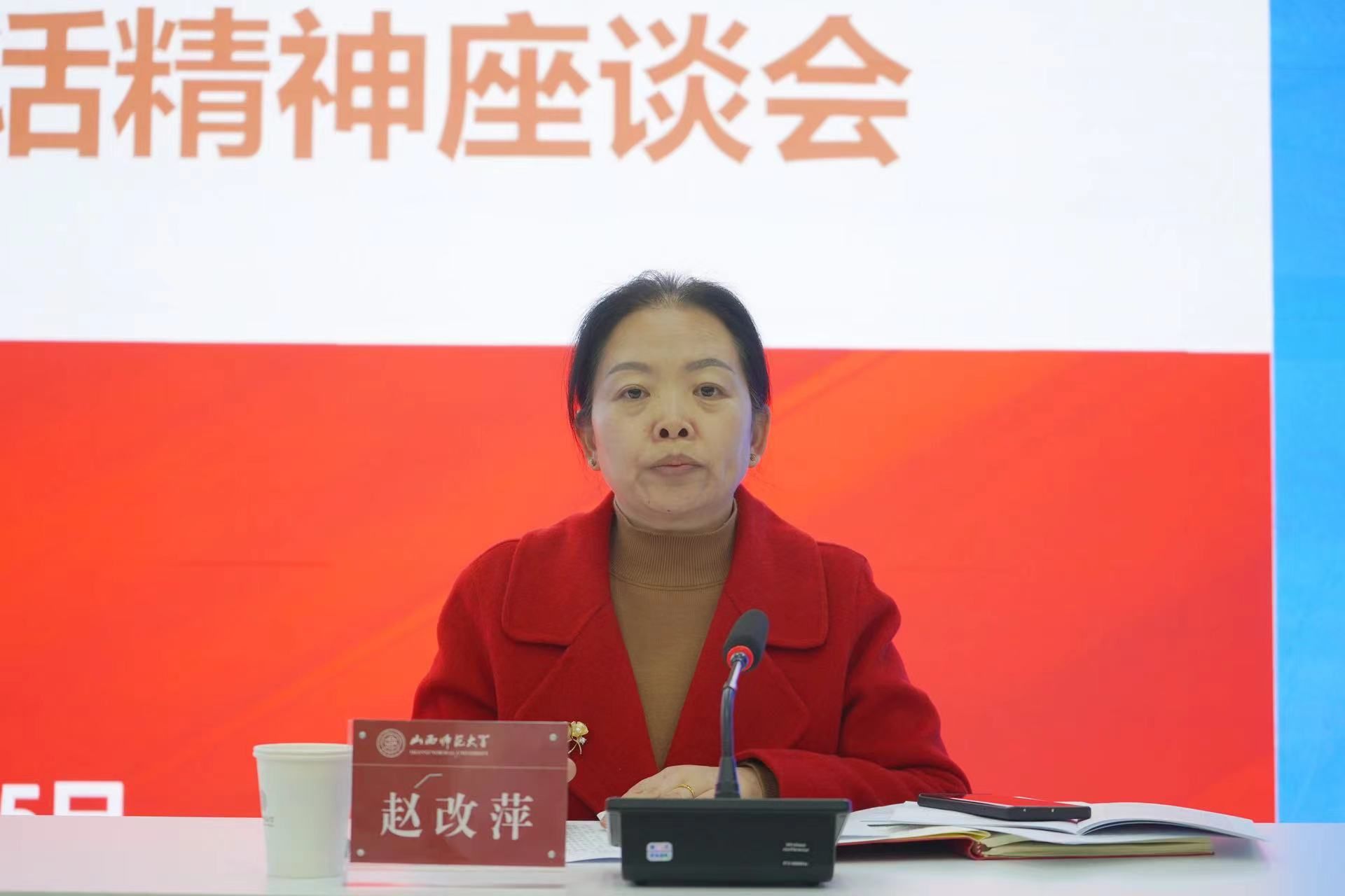 全国优秀教师、学校思想政治理论课教师座谈会参会代表赵跃先教授围绕办好思政课地位作用、思政课教师能力素质、上好学生真心喜爱进行了专题领学。教师代表杨源、周慧红分别结合课堂教学、当好思政课教师进行了交流发言。