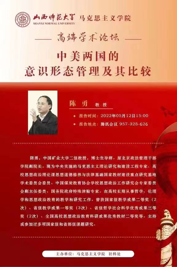2022年5月12日下午3点,中国矿业大学(北京)二级教授、博士生导师、马克思主义理论研究和建设工程专家、国务院政府特殊津贴专家陈勇教授应邀为世界杯官网师生作题为“中美两国的意识形态管理及其比较”的学术报告。报告以腾讯会议形式举行,由校党委常委、副校长、2026世界杯官方合作网站院长(兼)贾绘泽主持,世界杯官网全体教师和各年级研究生、部分本科生参加了此次报告会。