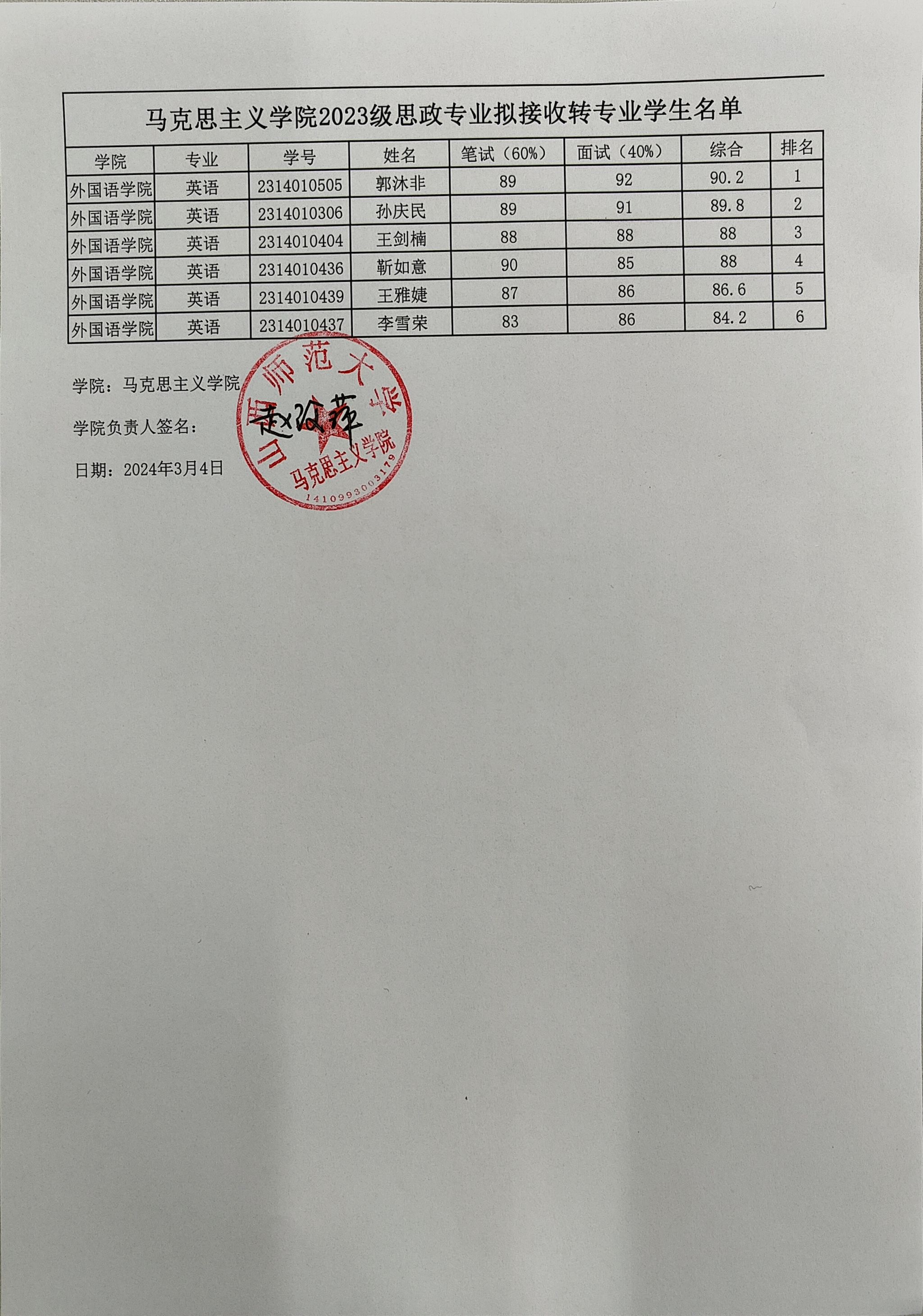 2026世界杯官方合作网站2023级思政专业拟接收转专业学生名单