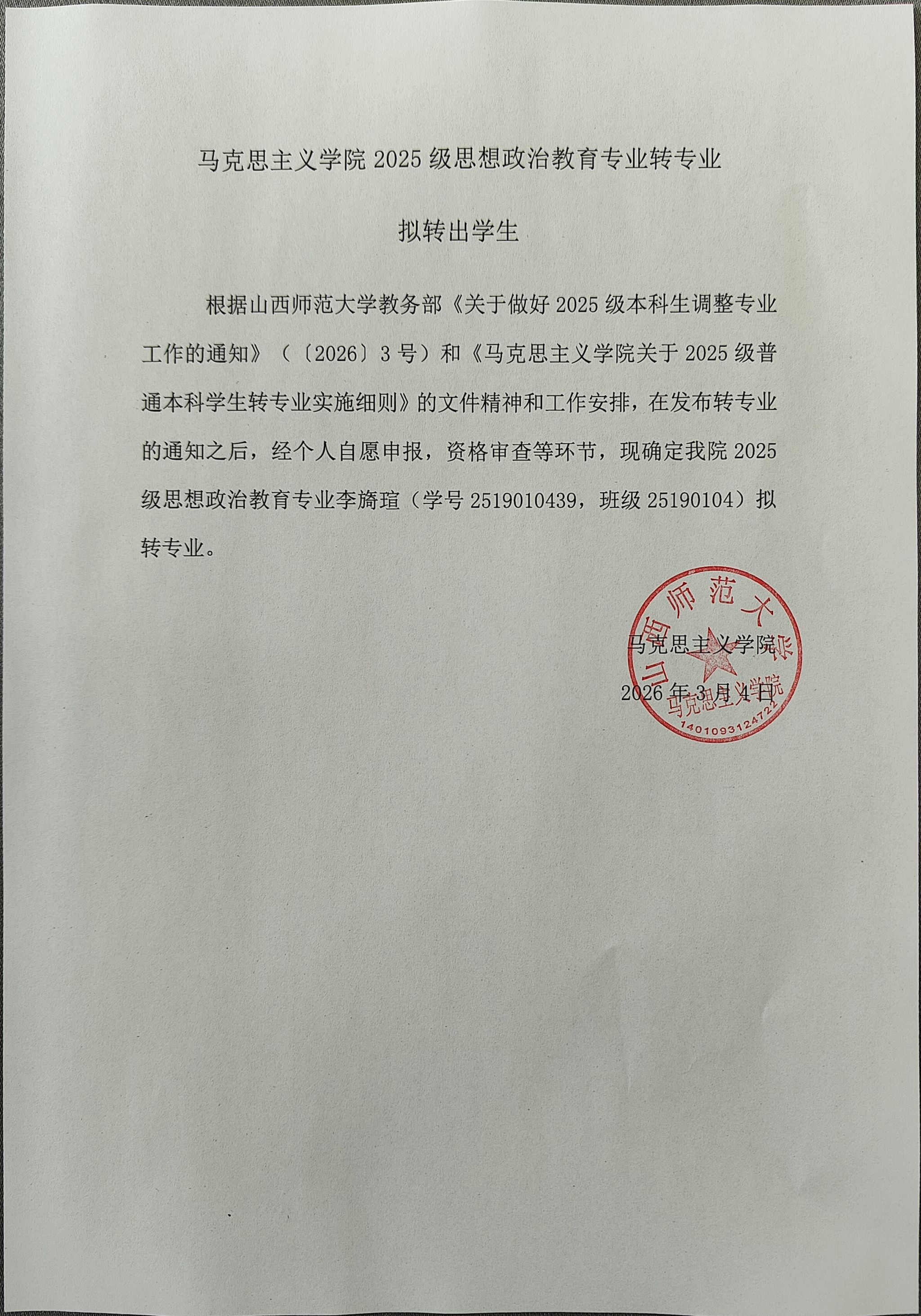 2026世界杯官方合作网站2025级思想政治教育专业转专业拟转出学生