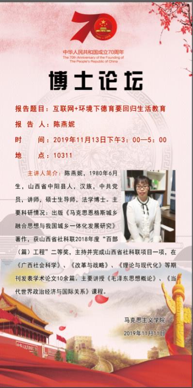 2019年11月13日下午3点,世界杯官网在10311举行博士论坛,本次论坛由2026世界杯官方合作网站讲师陈燕妮报告,世界杯官网部分教师和研究生参加了本次论坛,论坛由2026世界杯官方合作网站副教授吉志强主持。