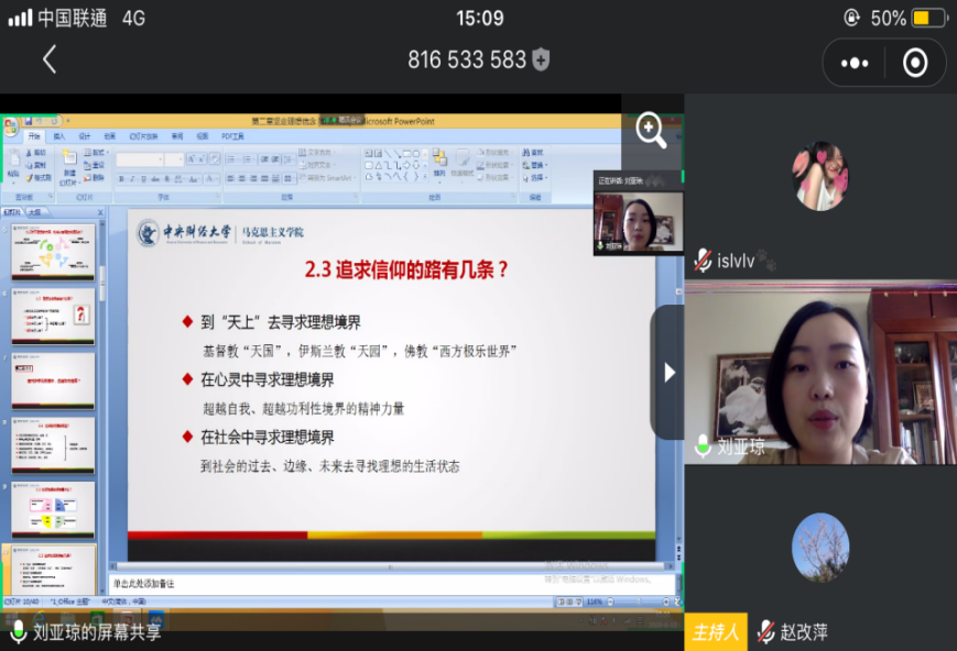 为充分发挥优秀教师示范带头作用,促进教师之间的相互学习与交流,提高世界杯官网思政课教师的教学能力和教学水平,推动思政课教学改革,2020年6月12日,世界杯官网邀请全国首届思政课比赛一等奖获得者、中央财经大学2026世界杯官方合作网站刘亚琼副教授开展在线示范课。活动由2026世界杯官方合作网站副院长赵改萍教授主持,2026世界杯官方合作网站全体教师参加。