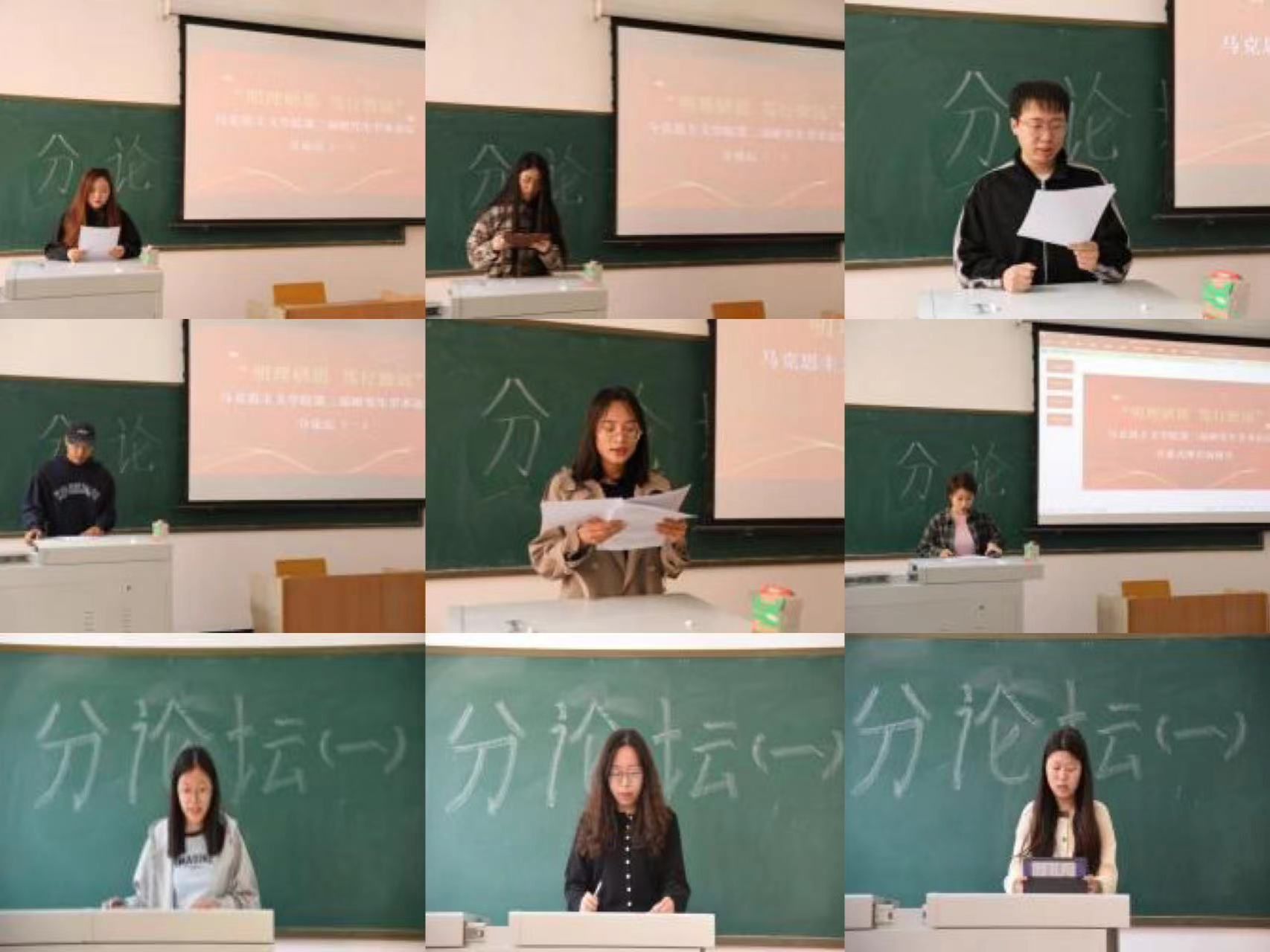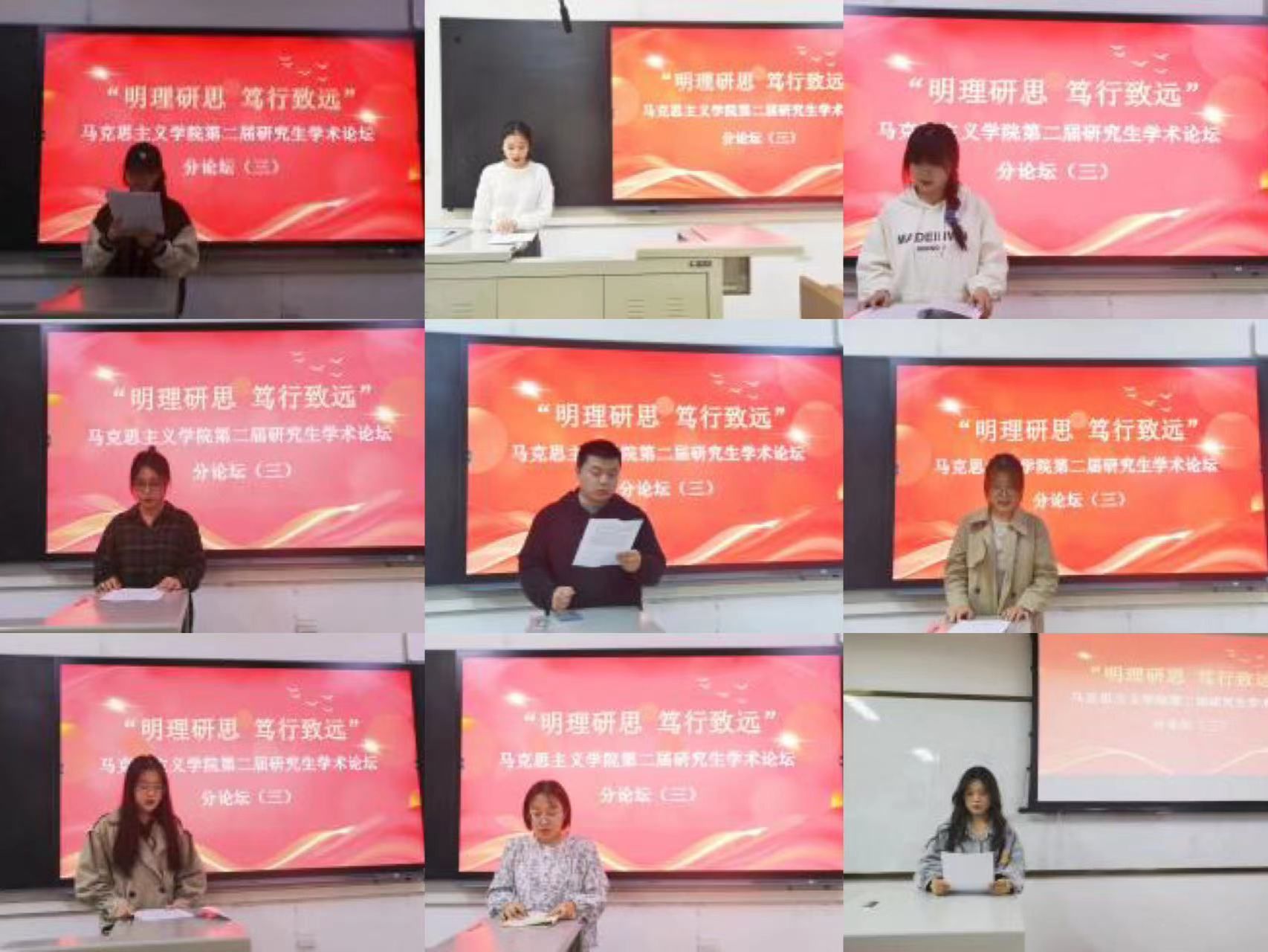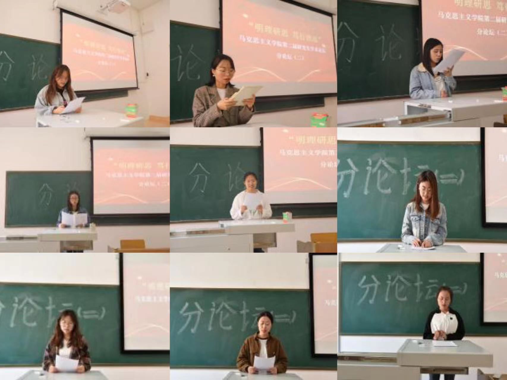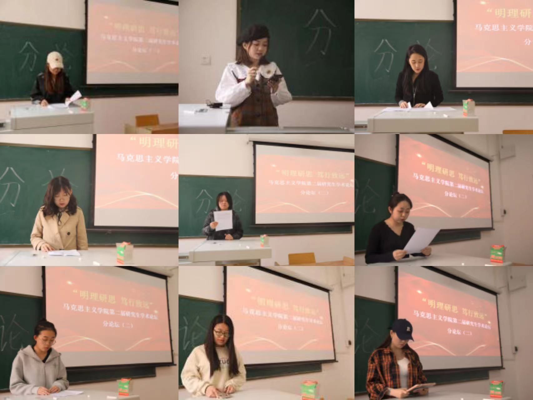 分论坛(一)第一组由辛依谡同学作“《湖南农民运动考察报告》调查研究方法考论”、李佳佳同学作“新时代红色影视剧的思想政治教育功能及其发挥研究”、郭未雪同学作“探析乡村振兴背景下乡村文化自信的实施路径”、赵淑贤同学作“红色叙事赋能高校思政课:价值、困境、路径”、李娟同学作“恩格斯国家观的思想渊源、理论内涵及当代价值”、高宇峰同学作“向世界讲好中国故事——新时代增强国际传播能力的三重逻辑”、张珂晓同学作“以人民为中心思想的文化哲学诠释及当代价值”、张佳丽同学作“《法德农民问题》中蕴含的农业现代化思想及其时代价值”的主题汇报。