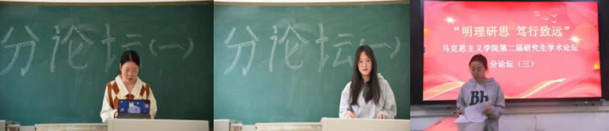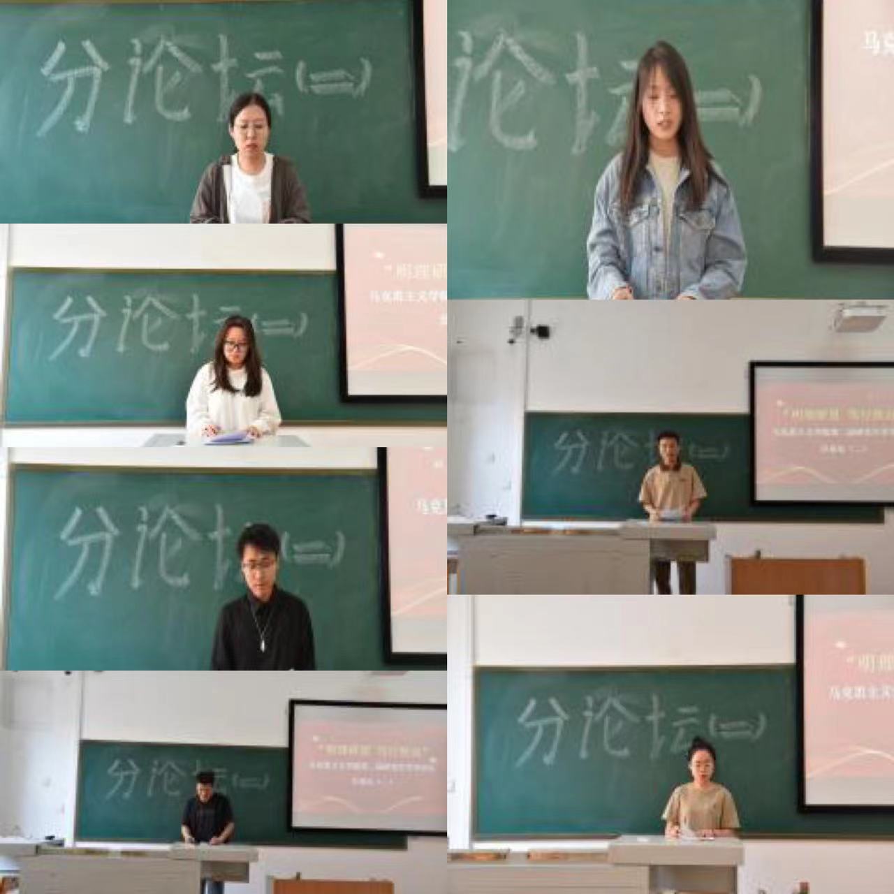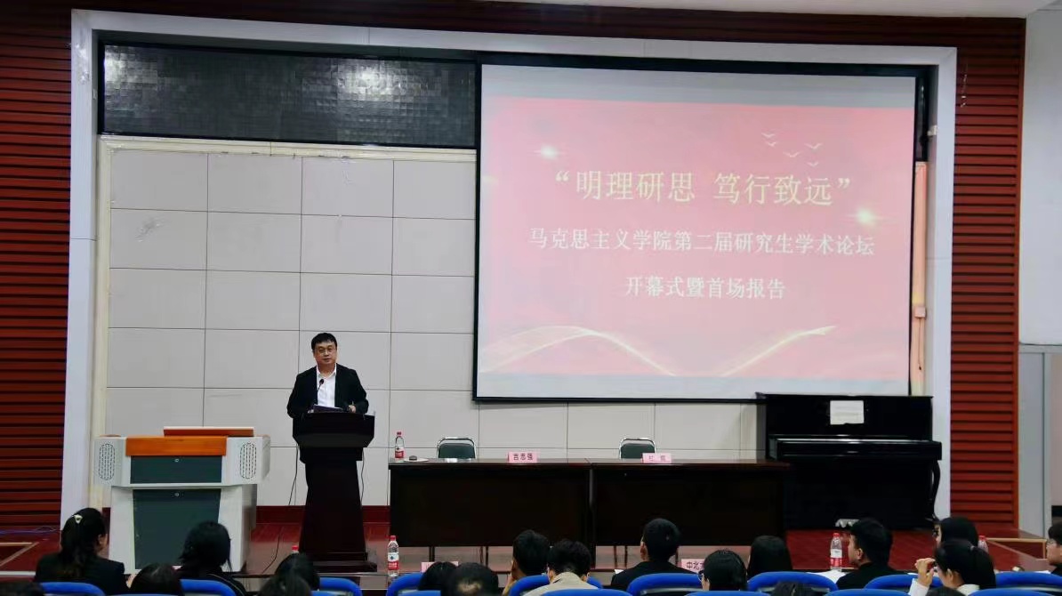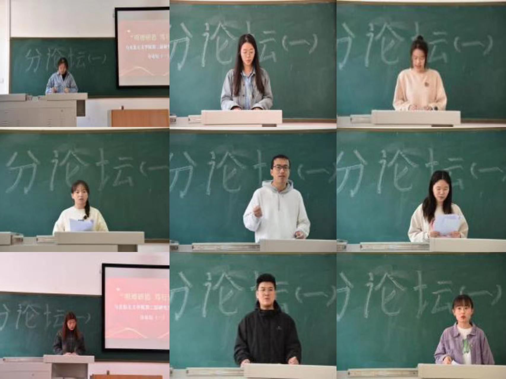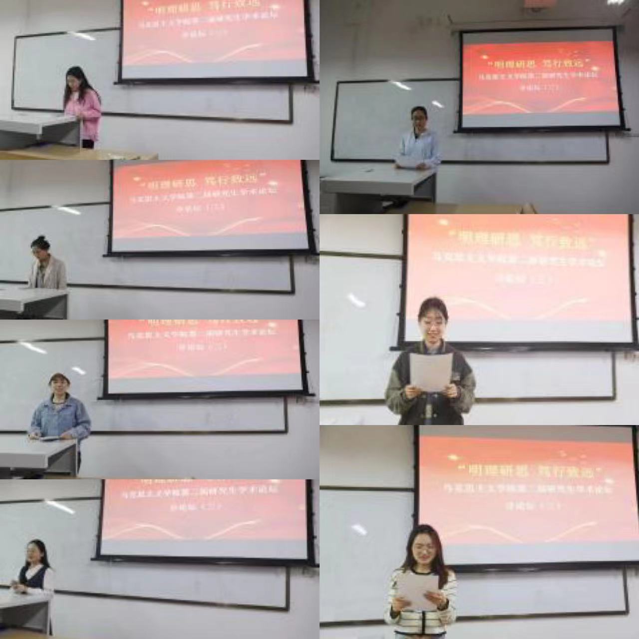 分论坛(一)第一组由辛依谡同学作“《湖南农民运动考察报告》调查研究方法考论”、李佳佳同学作“新时代红色影视剧的思想政治教育功能及其发挥研究”、郭未雪同学作“探析乡村振兴背景下乡村文化自信的实施路径”、赵淑贤同学作“红色叙事赋能高校思政课:价值、困境、路径”、李娟同学作“恩格斯国家观的思想渊源、理论内涵及当代价值”、高宇峰同学作“向世界讲好中国故事——新时代增强国际传播能力的三重逻辑”、张珂晓同学作“以人民为中心思想的文化哲学诠释及当代价值”、张佳丽同学作“《法德农民问题》中蕴含的农业现代化思想及其时代价值”的主题汇报。