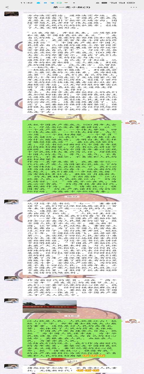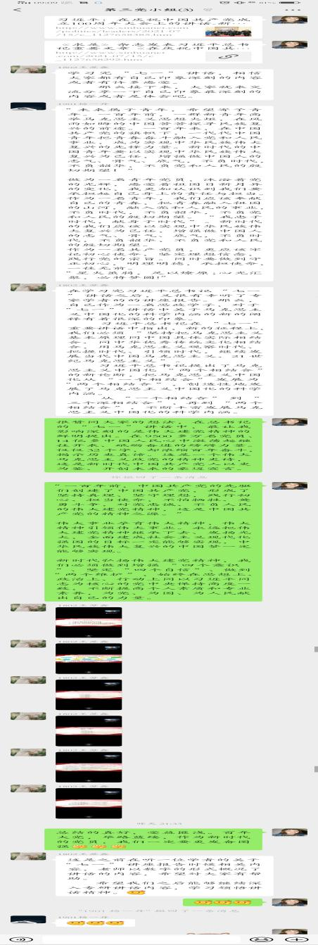 随后,各党小组代表作出发言,全体成员参与交流讨论。在召开本次会议之前,各党小组就七一讲话内容进行了学习和讨论。会上,各党小组代表主要从讲话内容与党史学习、与人民群众、与青年,以及与中国特色社会主义制度优势的关系等方面对学习心得进行了分享。大家认为作为新时代中国青年,应当认真学习领会习近平总书记重要讲话精神,矢志为实现中华民族伟大复兴而奋斗。