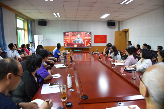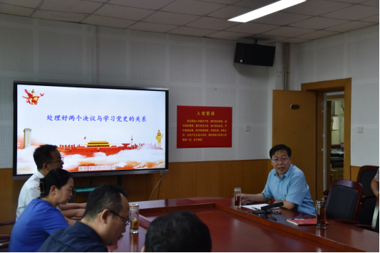 第三阶段,贾绘泽院长为全体教职工党员讲授题为“处理好两个决议与学习党史的关系”的党课。他从“两个决议”的提出背景、主要内容以及历史地位出发,阐明“两个决议”是学习党史的根本遵循和依据、“两个决议”蕴涵着学习党史的科学方法论,引导大家在“两个决议”的基础上深化对党的历史的认识,并指出“两个决议”后的党史学习要遵循党的其他相关文献。