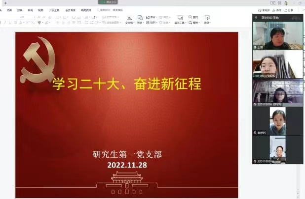 11月28日,世界杯官网研究生第一党支部以党的二十大精神交流研讨为主要内容,开展“学习二十大、奋进新征程”主题党日活动,全体党员参加交流。