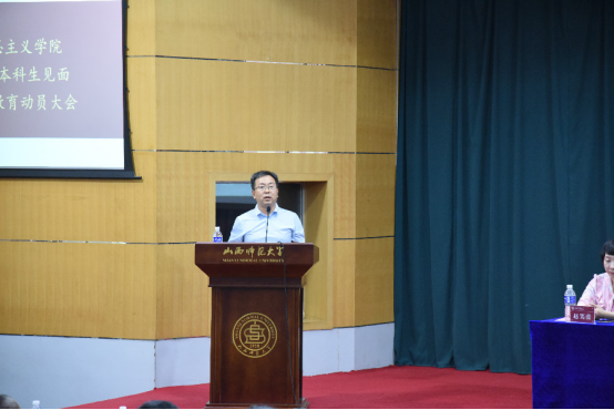 最后,院党委书记王银老师讲话。他对新生提出了五点期望:要爱国立志、要求真力行、要拥有梦想、要爱校荣院及要学会生活。希望新生要正确对待大学生活中的机遇与挑战,克服不良生活习惯,并希冀学生能够专注学习,奋发有为,努力成为一名“学高为师,身正为范”的新时代师大人。