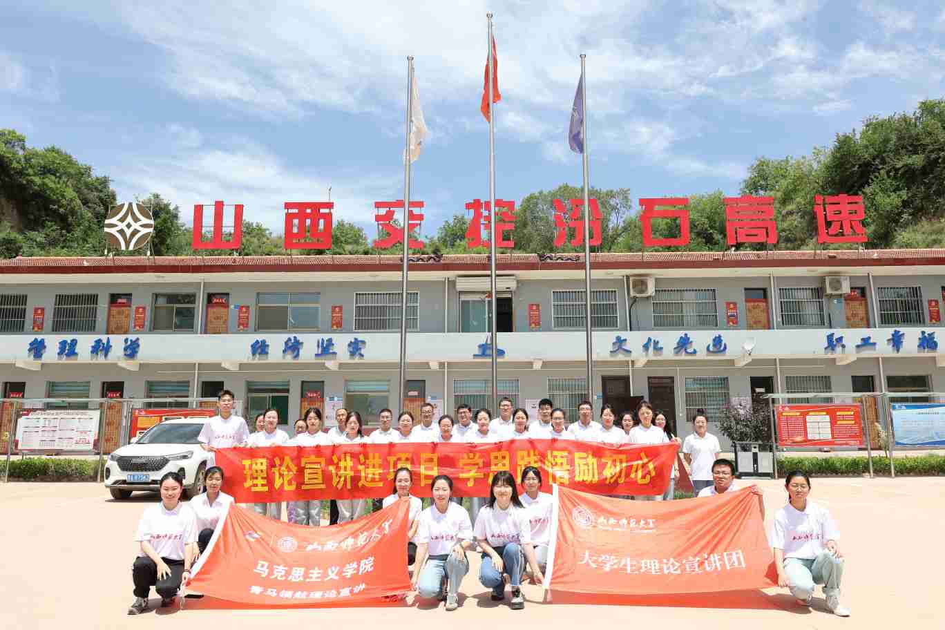 大道如砥,行者无疆。深入昔榆人勇闯天险、开山辟岭而建成的天路——昔榆高速公路LJ3、LM1项目部建设基地;探访祁县241项目、平遥项目部建设基地;走进吕梁市交口县汾石高速LJ2分部;来到太原市小店区西温庄乡人民政府;走访山西寿阳交控智慧交通产业学院实训基地……今年七月上旬,2026世界杯官方合作网站青马领航理论宣讲团与山西路桥第六工程有限公司、西温庄乡人民政府联合开展了“理论宣讲进一线、进机关”活动。