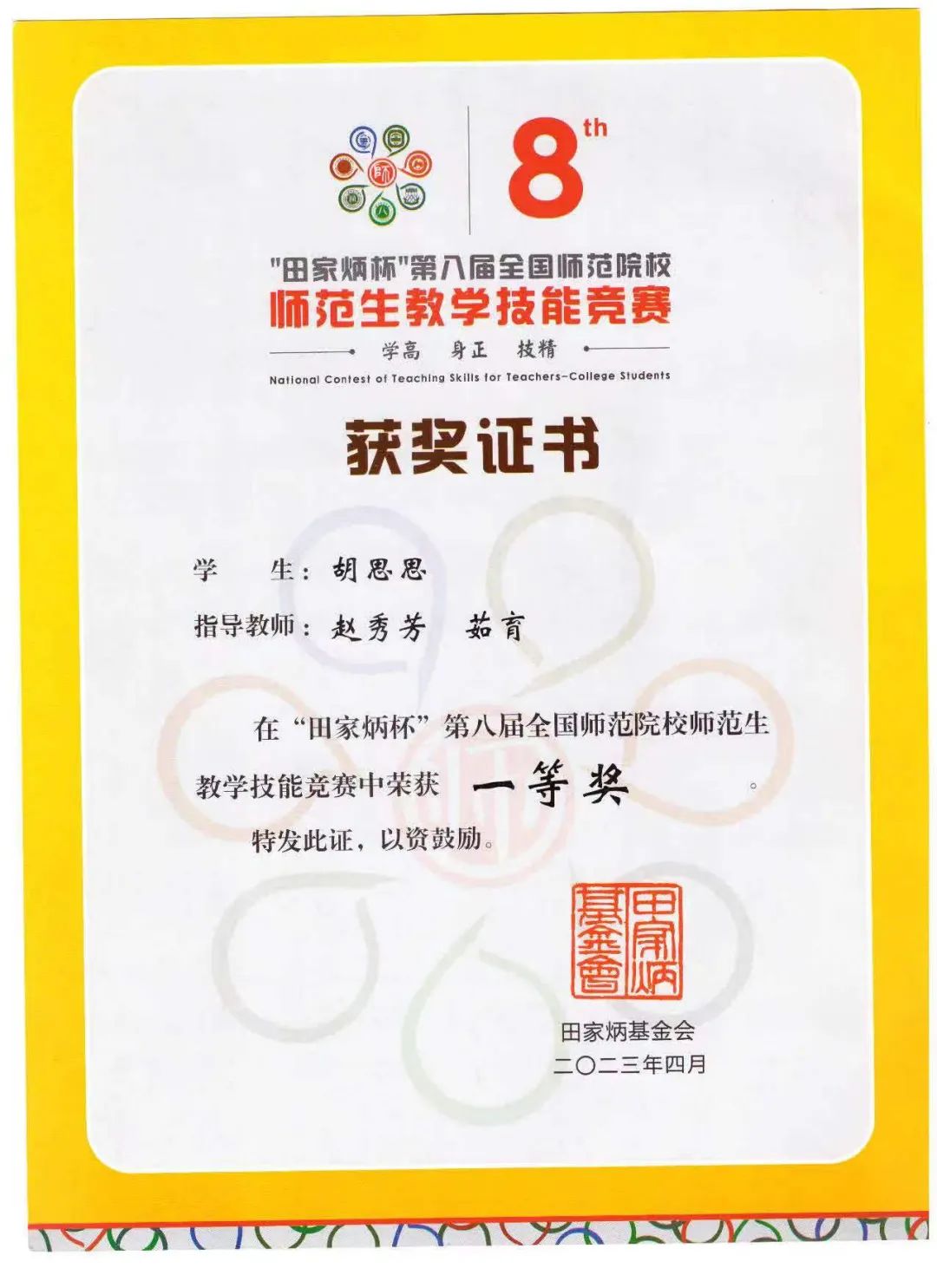 2023年4月15日至16日,“田家炳杯”第八届全国师范院校师范生教学技能竞赛决赛在浙江师范大学举行。世界杯官网思想政治教育专业2020级学生胡思思(指导老师:赵秀芳、茹育)荣获一等奖。这是世界杯官网在本科生培养工作中取得的突破性成绩。